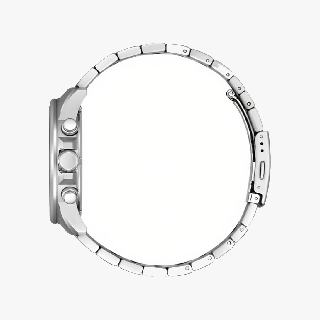 Silver-tone stainless steel case and bracelet. Fixed silver-tone stainless steel bezel. Green dial with luminous silver-tone hands and index-Arabic numeral markings at the 12 o’clock position hour markers. Minute markers around the outer rim. Dial Type: Analog. Luminescent hands and markers. Date display at the 3 o’clock position. Quartz movement. Scratch resistant mineral crystal. Pull / push crown. Solid case back. Round case shape, case size: 43 mm. Fold over clasp with a safety release. Water resistant at 100 meters / 330 feet. Functions: chronograph, date, hour, minute, second. Sport watch style. Watch label: Japan Movt. Citizen Chronograph Quartz Green Dial Watch AN3690-56X.
