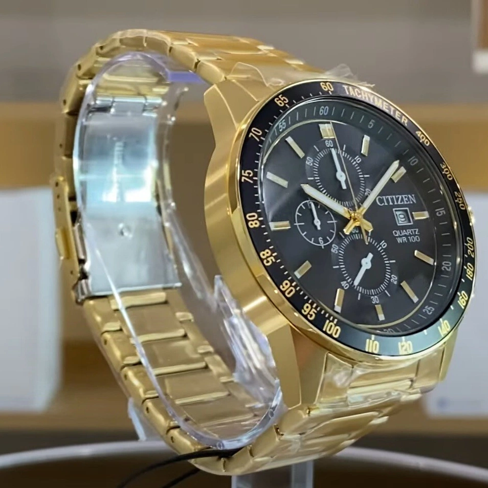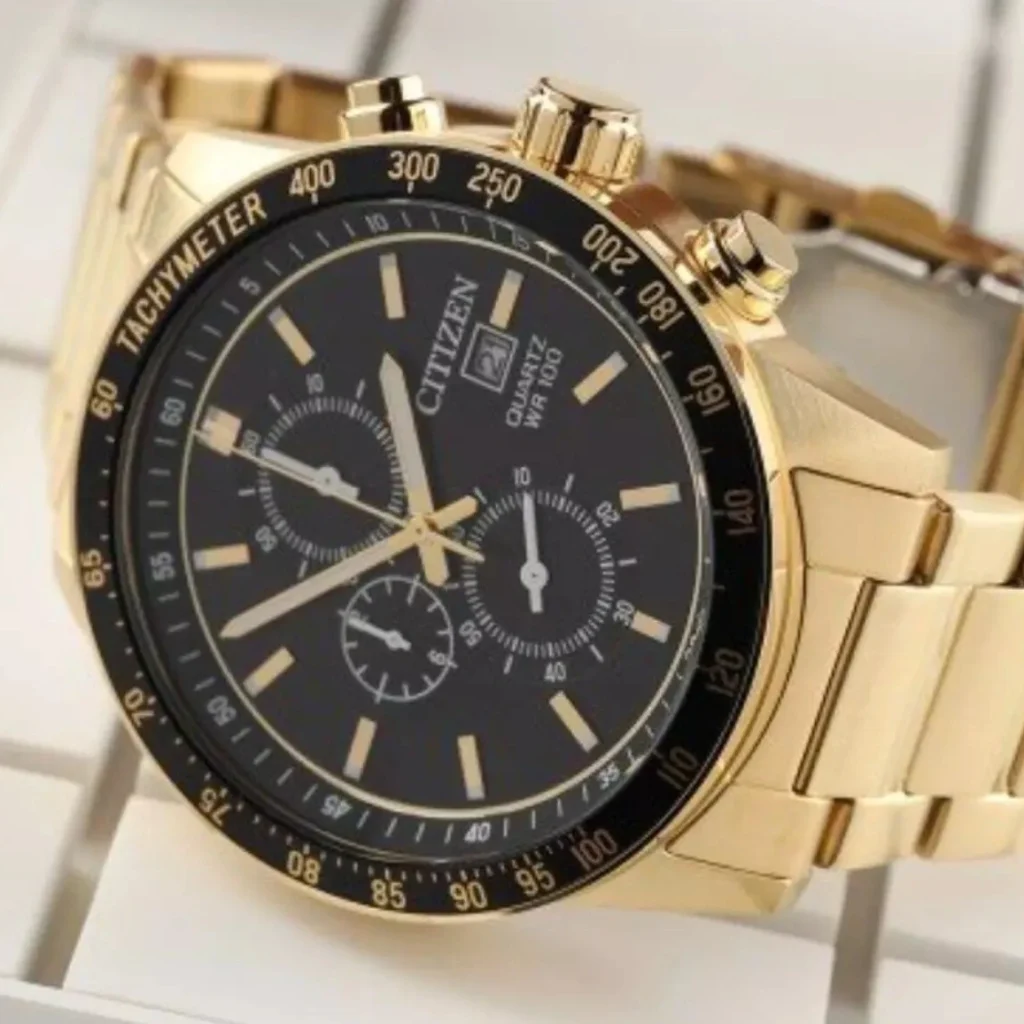 Gold-tone stainless steel case and bracelet. Fixed black stainless steel bezel. Black dial with gold-tone hands and index hour markers. Minute markers around the outer rim. Dial Type: Analog. Luminescent hands and markers. Date display at the 3 o’clock position. Chronograph – three sub-dials displaying: 60 second, 60 minute and 24 hour. Citizen Caliber 0510-C0A quartz movement. Scratch resistant mineral crystal. Solid case back. Round case shape, case size: 44 mm. Fold over clasp with a safety release. Water resistant at 100 meters / 330 feet. Functions: chronograph, date, hour, minute, second. Sport watch style.