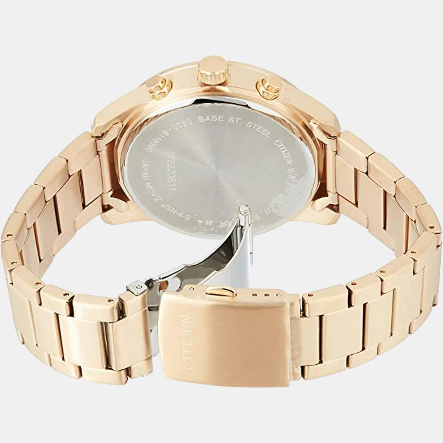 Blue dial enhanced by luminous rose gold-tone hands. Rose Gold-tone stainless steel case with a rose gold-tone stainless steel band. Quartz movement. 50 meters / 165 feet water resistance. Fixed bezel. Scratch Resistant Mineral crystal. Solid caseback. Fold Over with Push Button Release clasp. Case size 44 mm x 12 mm. Band 22 mm x long. Citizen AN8169-58L Watch.